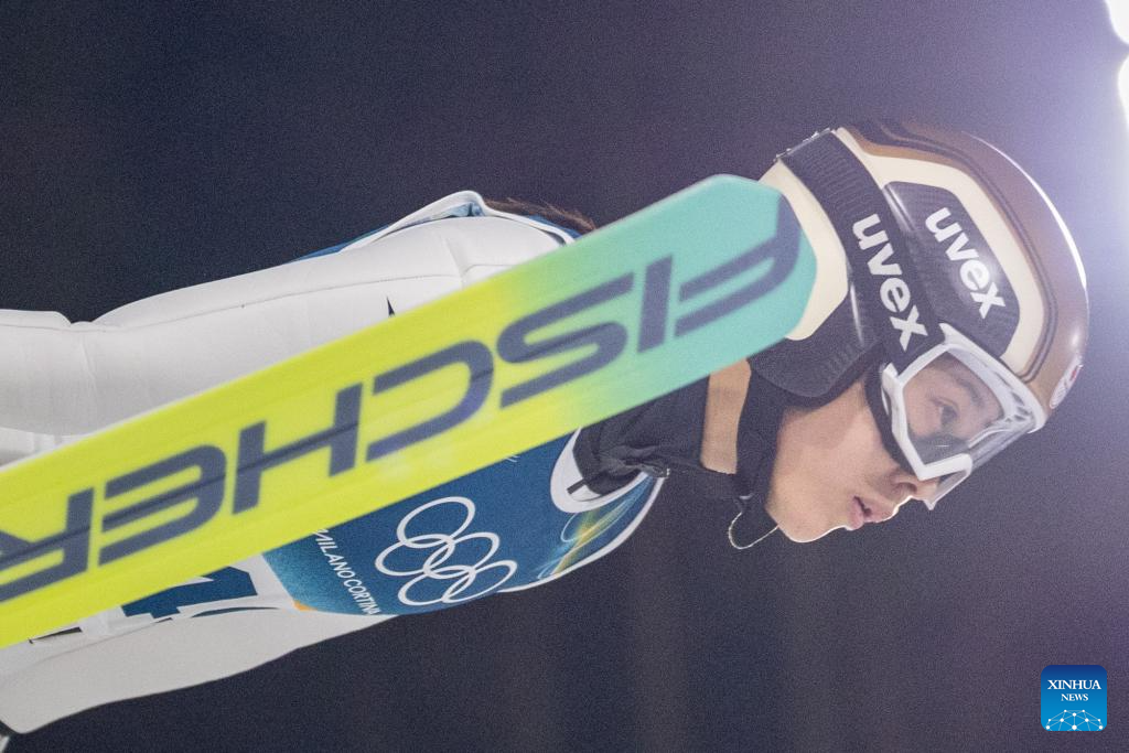 Maruyama Nozomi of Japan competes during the Ski Jumping Women's Normal Hill Individual of the 2026 Milan-Cortina Winter Olympics in Predazzo, Italy, Feb. 7, 2026. (Xinhua/Huang Wei)