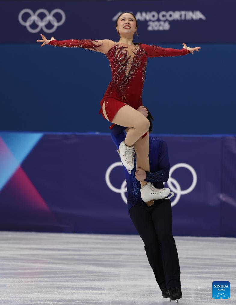 (260208) -- MILAN, Feb. 8, 2026 (Xinhua) -- Charlene Guignard (bottom)/Marco Fabbri of Italy perform during the free dance of ice dance skating for figure skating team event at the Milan-Cortina 2026 Olympic Winter Games in Milan, Italy, Feb. 7, 2026. (Xinhua/Li Ming)