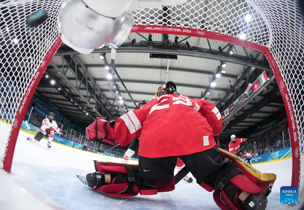 (260208) -- MILAN, Feb. 8, 2026 (Xinhua) -- Goalkeeper Saskia Maurer of Switzerland fails to save a goal during the ice hockey women's preliminary round group A match between Switzerland and Canada at the Milan-Cortina 2026 Olympic Winter Games in Milan, Italy, Feb. 7, 2026. (Tao Xiyi/Pool via Xinhua)