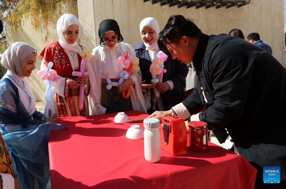 Jordanians watch a Chinese artist painting at a Chinese cultural and tourism fair in Amman, Jordan, Feb. 7, 2026. (Photo by Mohammad Abu Ghosh/Xinhua)