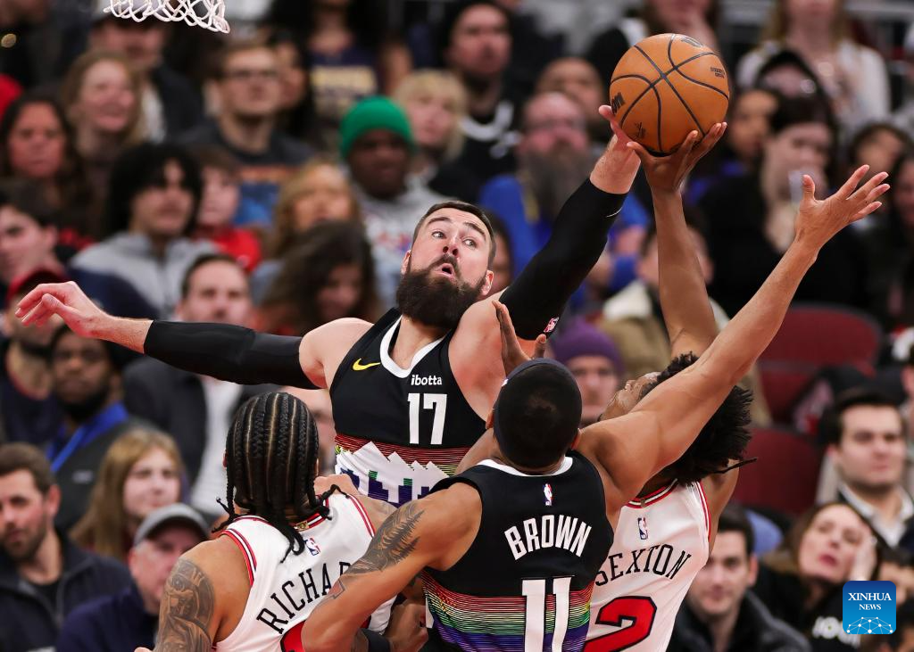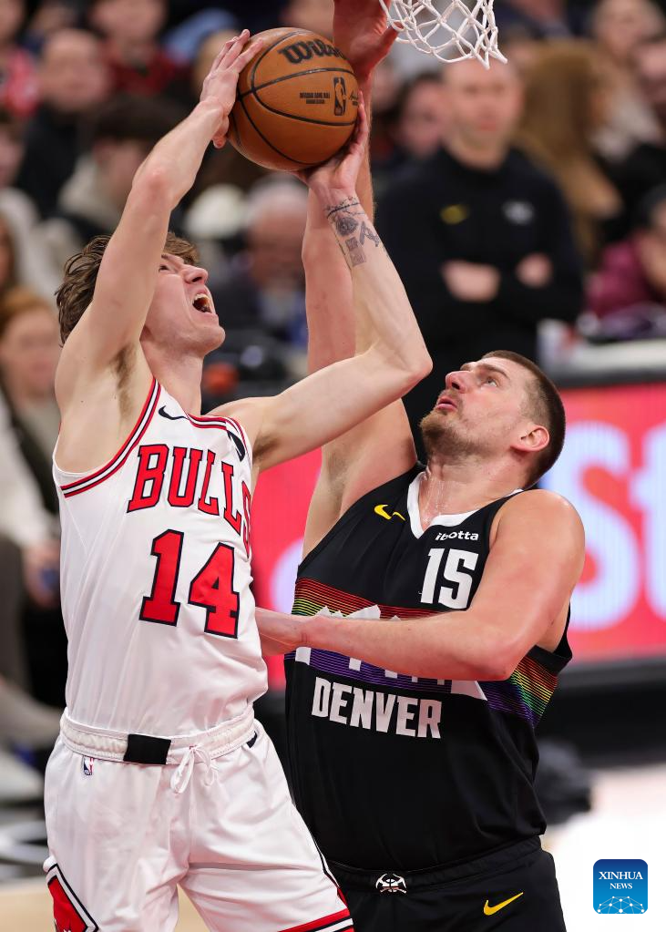 Denver Nuggets' Jonas Valanciunas (top) blocks a shot during the NBA regular season game between Denver Nuggets and Chicago Bulls at United Center in Chicago, the United States, Feb. 7, 2026. (Photo by Joel Lerner/Xinhua)