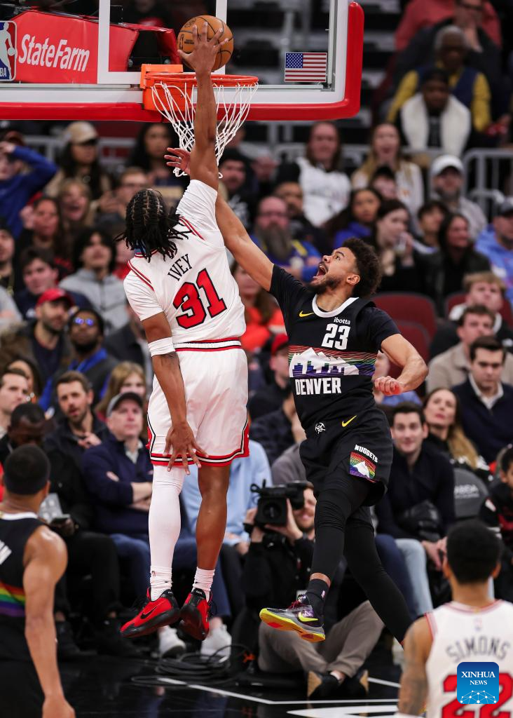Chicago Bulls' Jaden Ivey (L) dunks during the NBA regular season game between Denver Nuggets and Chicago Bulls at United Center in Chicago, the United States, Feb. 7, 2026. (Photo by Joel Lerner/Xinhua)