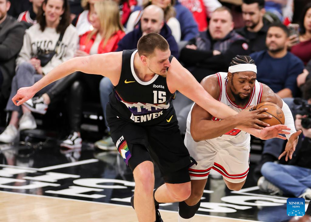 Denver Nuggets' Nikola Jokic (L) vies with Chicago Bulls' Guershon Yabusele during the NBA regular season game between Denver Nuggets and Chicago Bulls at United Center in Chicago, the United States, Feb. 7, 2026. (Photo by Joel Lerner/Xinhua)