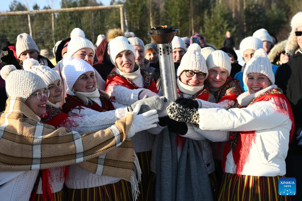People in traditional costumes pose for photos with a torch in a winter dance festival in Kohtla-Nomme, Estonia, Feb. 7, 2026. (Photo by Sergei Stepanov/Xinhua)