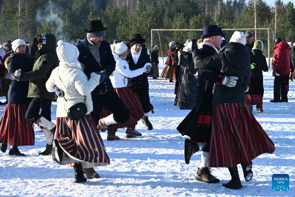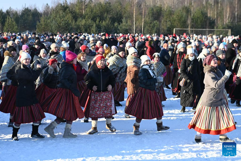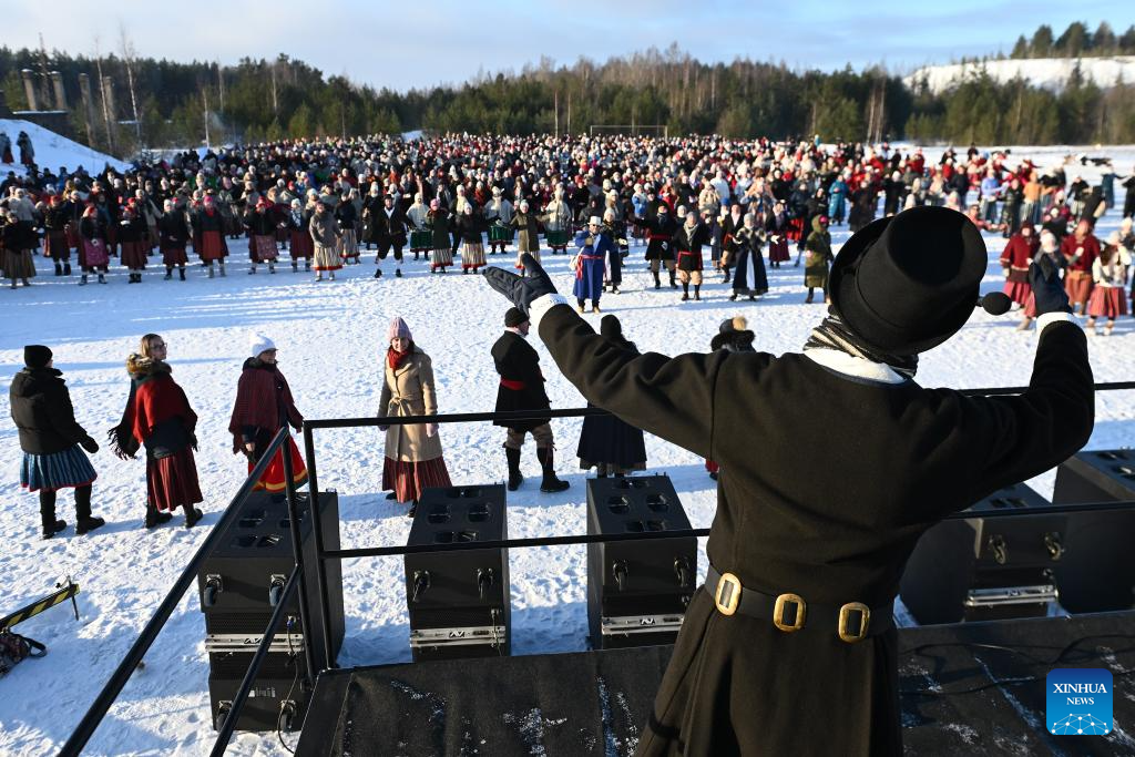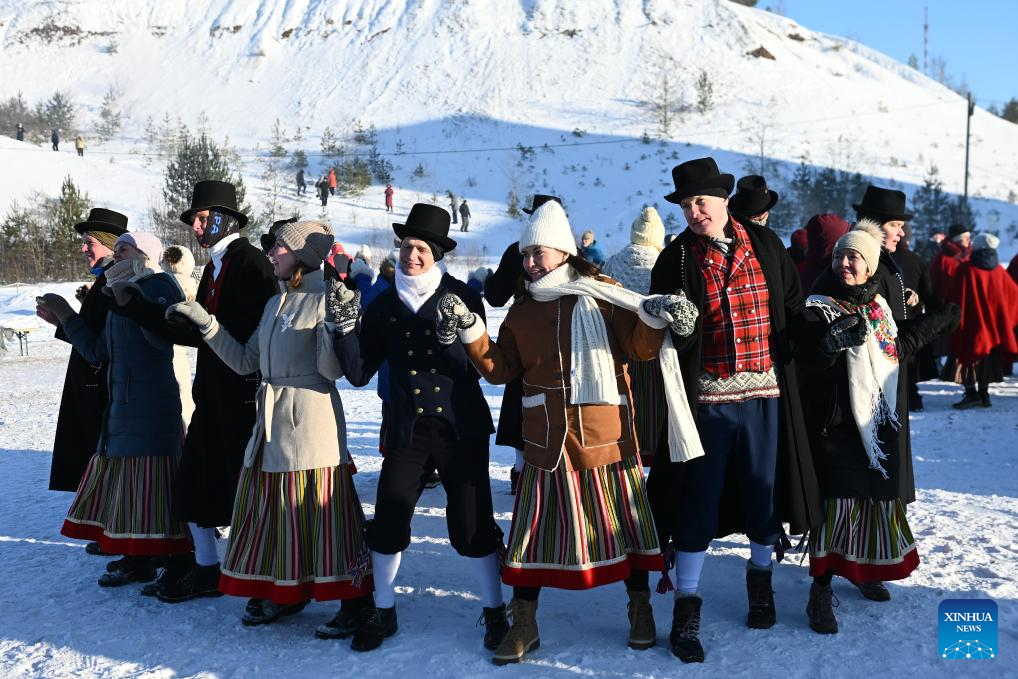 People in traditional costumes take part in a winter dance festival in Kohtla-Nomme, Estonia, Feb. 7, 2026. (Photo by Sergei Stepanov/Xinhua)