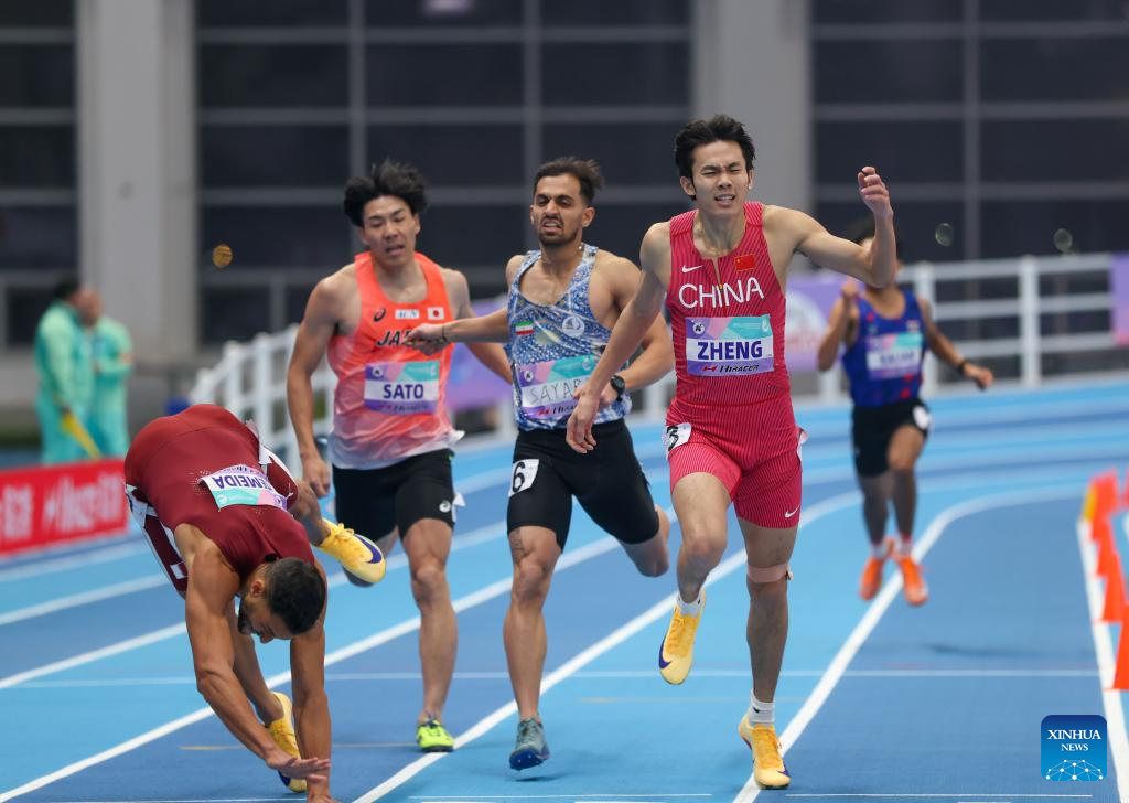 Zheng Chiyu (front R) of China sprints during the men's 400m final at the 12th Asian Indoor Athletics Championships 2026 in Tianjin, north China, Feb. 7, 2026. (Xinhua/Sun Fanyue)
