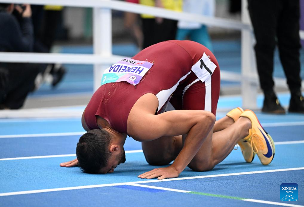 Hemeida Bassem Mohamed A A of Qatar celebrates after the men's 400m final at the 12th Asian Indoor Athletics Championships 2026 in Tianjin, north China, Feb. 7, 2026. (Xinhua/Zhao Zishuo)