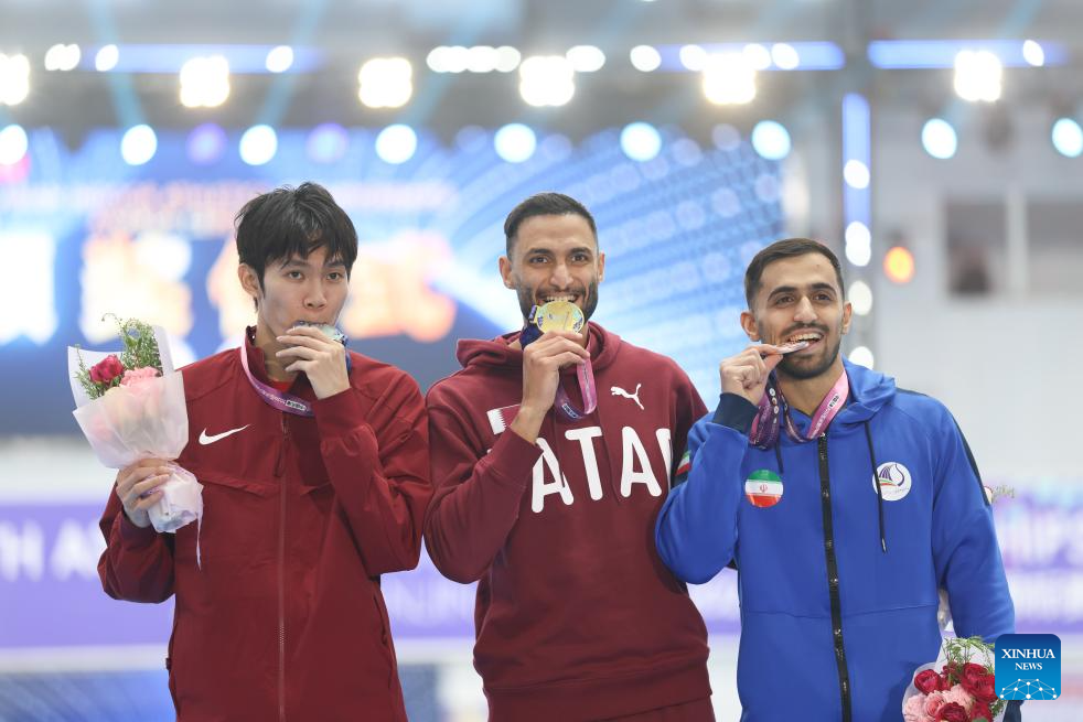 Gold medalist Hemeida Bassem Mohamed A A (C) of Qatar, silver medalist Zheng Chiyu (L) of China and bronze medalist Sayari Arash of Iran pose on the podium after the men's 400m final at the 12th Asian Indoor Athletics Championships 2026 in Tianjin, north China, Feb. 7, 2026. (Xinhua/Sun Fanyue)