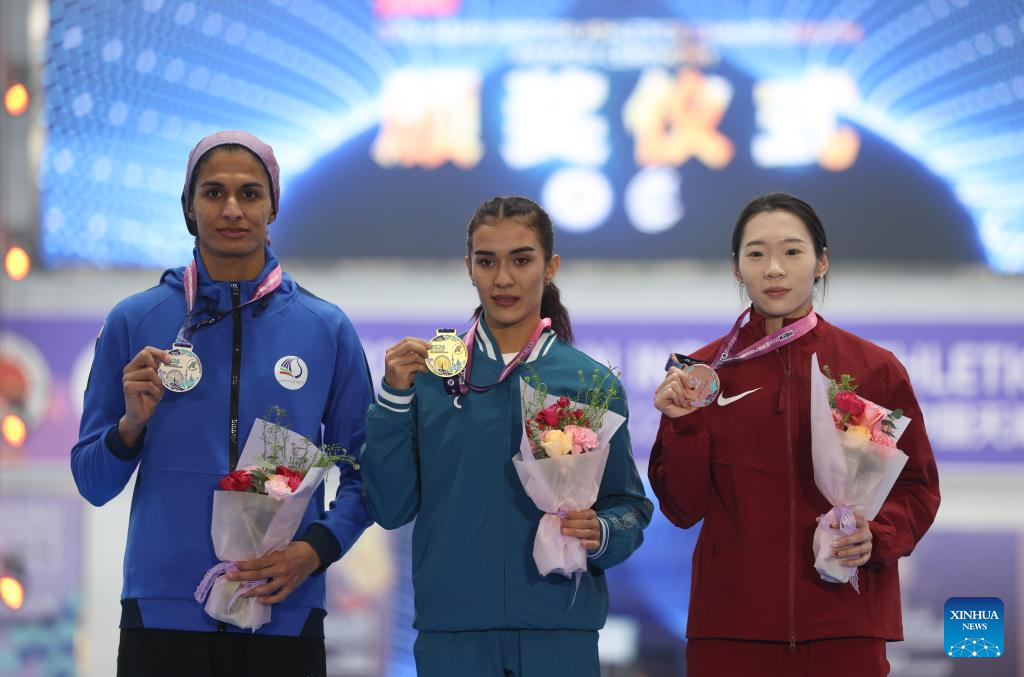 Gold medalist Hukmova Jonbibi (C) of Uzbekistan, silver medalist Zarei Manoujan Zahra (L) of Iran and bronze medalist Zuo Siyu of China pose on the podium after the women's 400m final at the 12th Asian Indoor Athletics Championships 2026 in Tianjin, north China, Feb. 7, 2026. (Xinhua/Sun Fanyue)