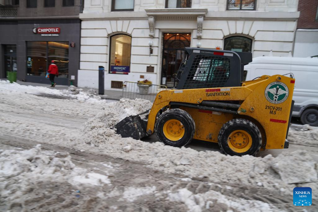 A snowplow removes accumulated snow on a street in New York City, the United States, on Feb. 7, 2026. (Xinhua/Zhang Fengguo)