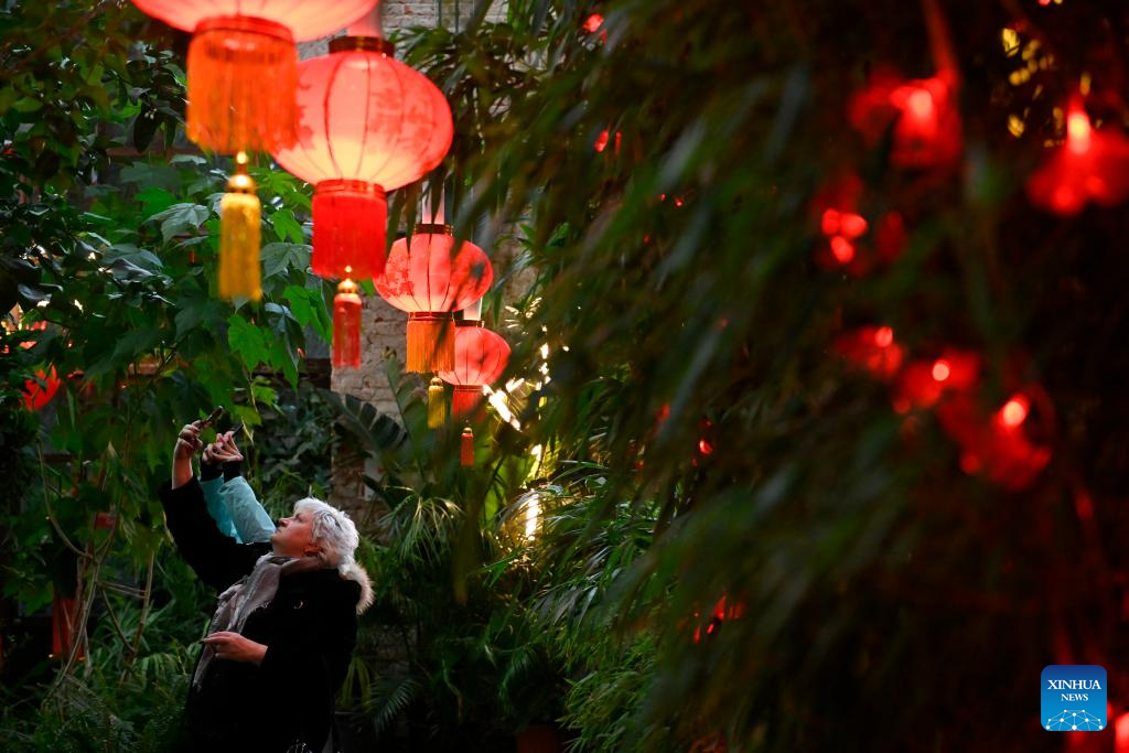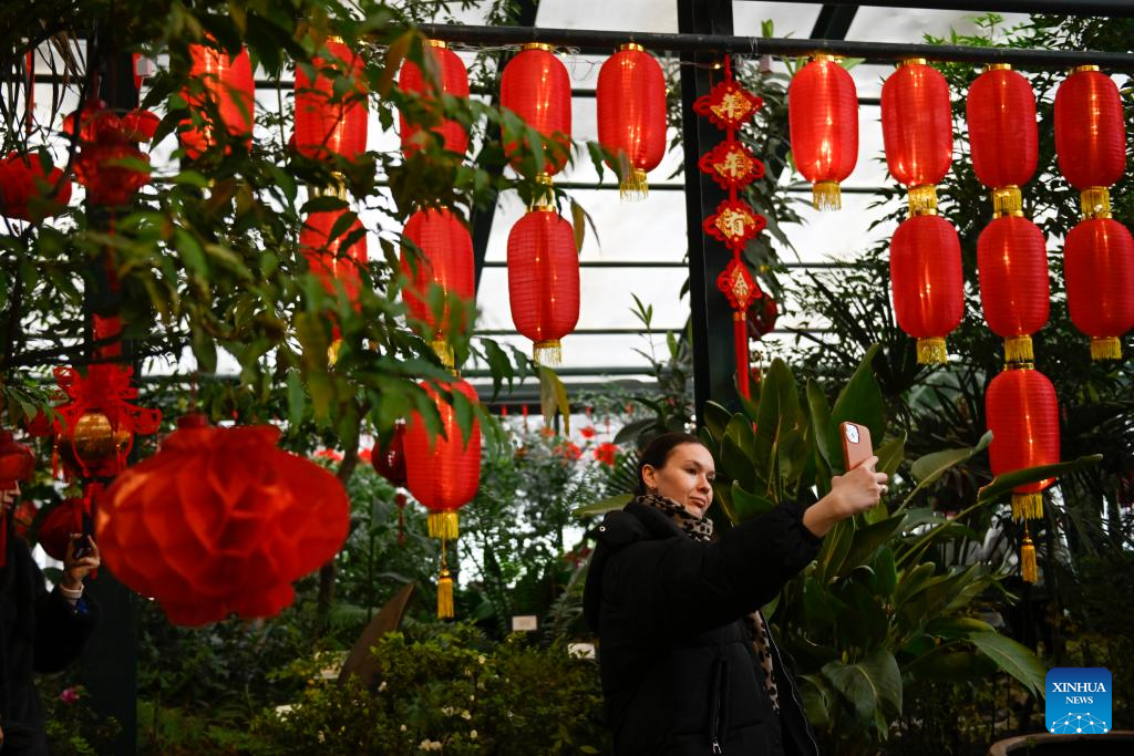 Visitors take photos of Spring festival decorations at the subtropical greenhouse of the Moscow State University's Apothecary Garden in Moscow, Russia, Feb. 7, 2026. (Photo by Alexander Zemlianichenko Jr/Xinhua)