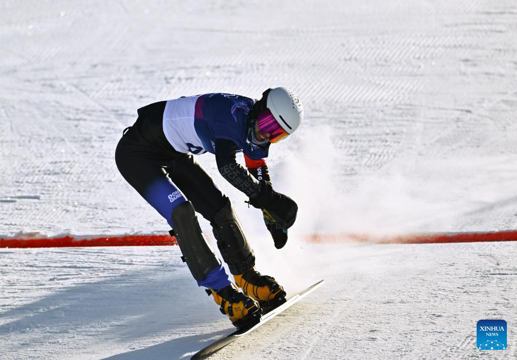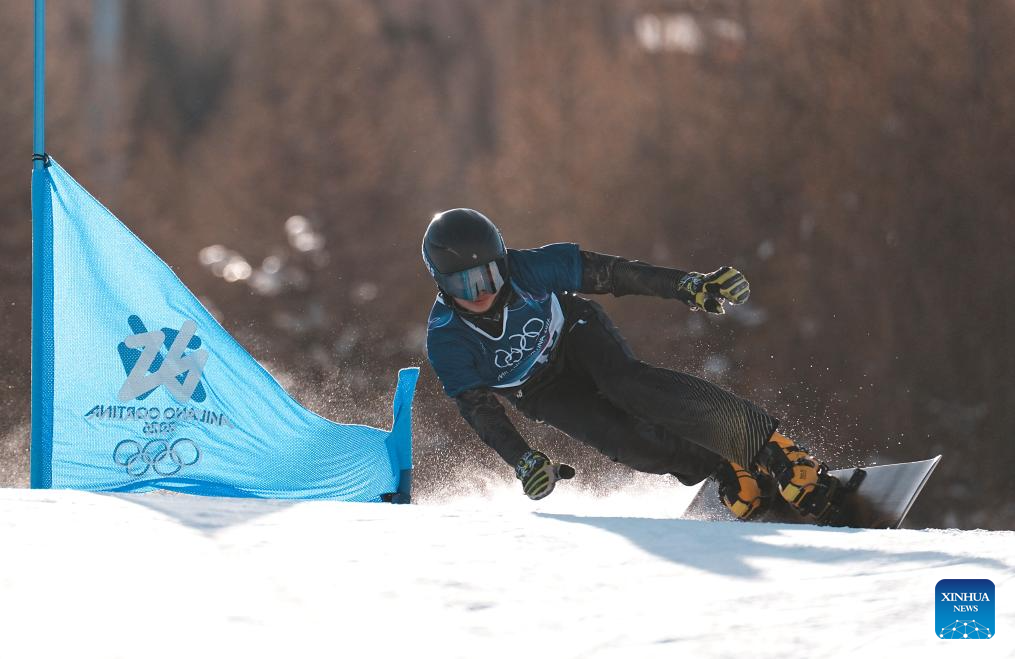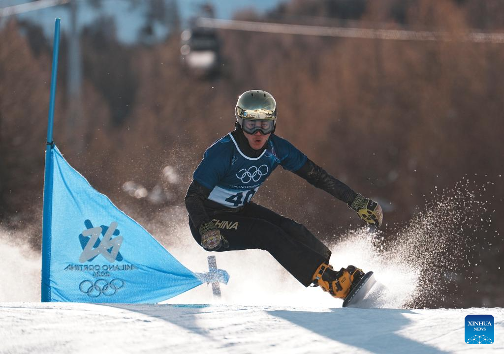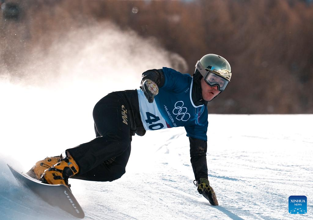 Bi Ye of China competes during the Snowboard Men's Parallel Giant Slalom Qualification at the Milan-Cortina 2026 Olympic Winter Games in Livigno, Italy, Feb. 8, 2026. (Xinhua/Hu Chao)