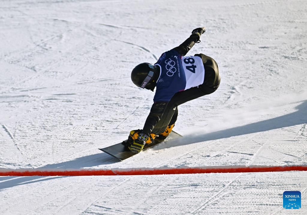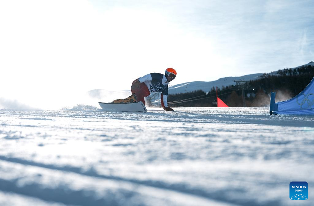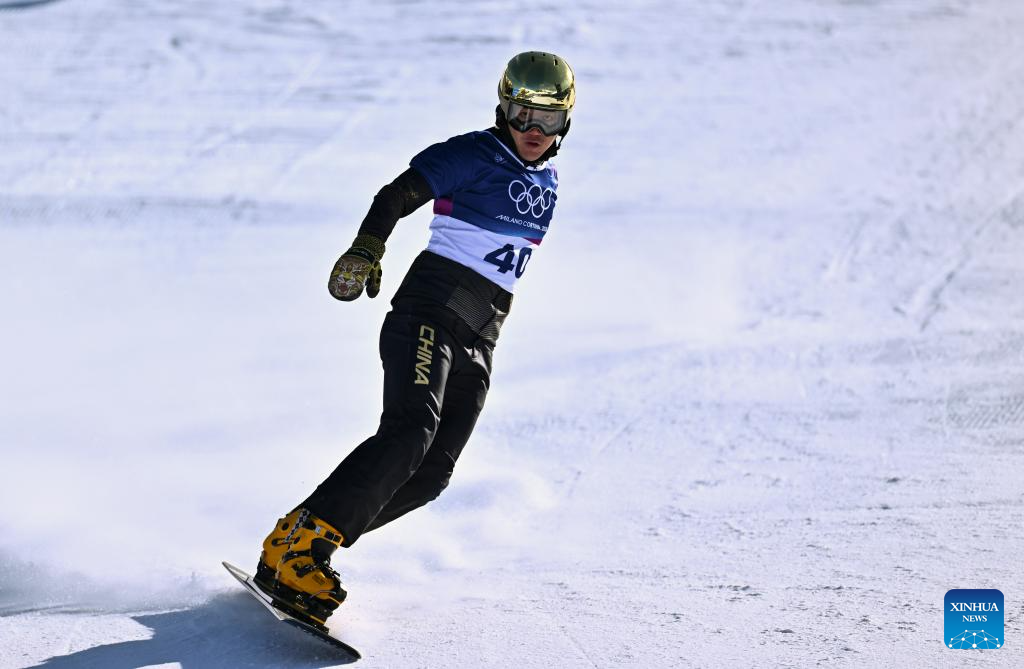 Bi Ye of China competes during the Snowboard Men's Parallel Giant Slalom Qualification at the Milan-Cortina 2026 Olympic Winter Games in Livigno, Italy, Feb. 8, 2026. (Xinhua/Zhang Hongxiang)