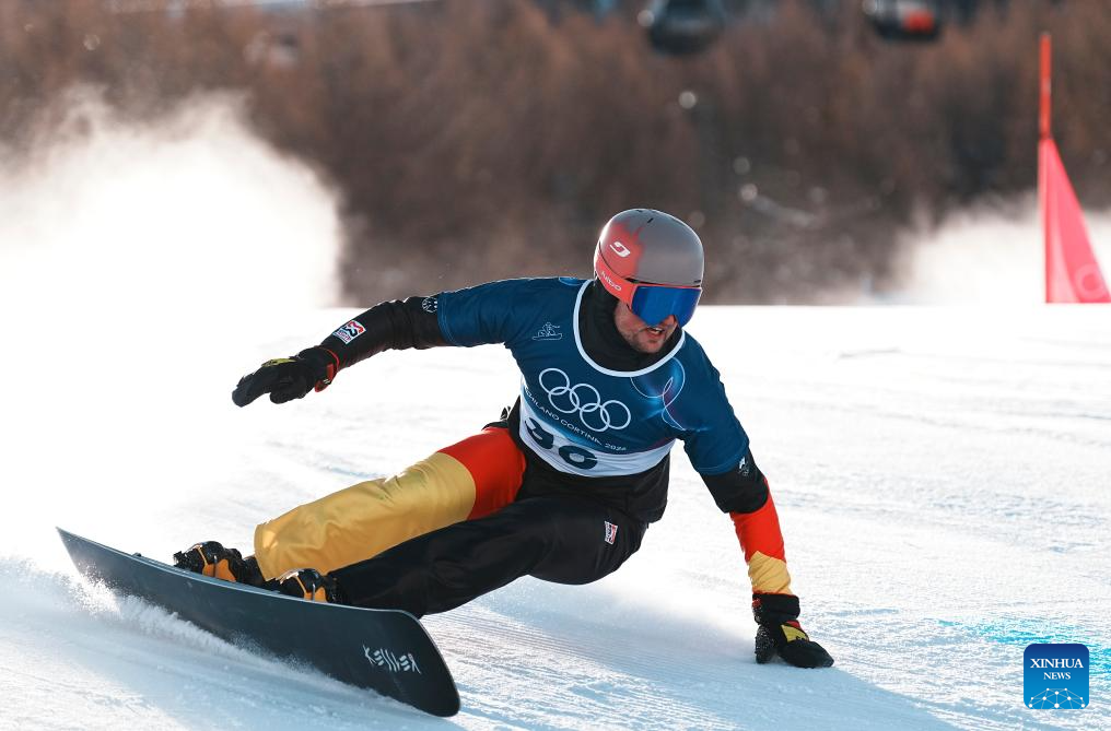 Yannik Angenend of Germany competes during the Snowboard Men's Parallel Giant Slalom Qualification at the Milan-Cortina 2026 Olympic Winter Games in Livigno, Italy, Feb. 8, 2026. (Xinhua/Hu Chao)