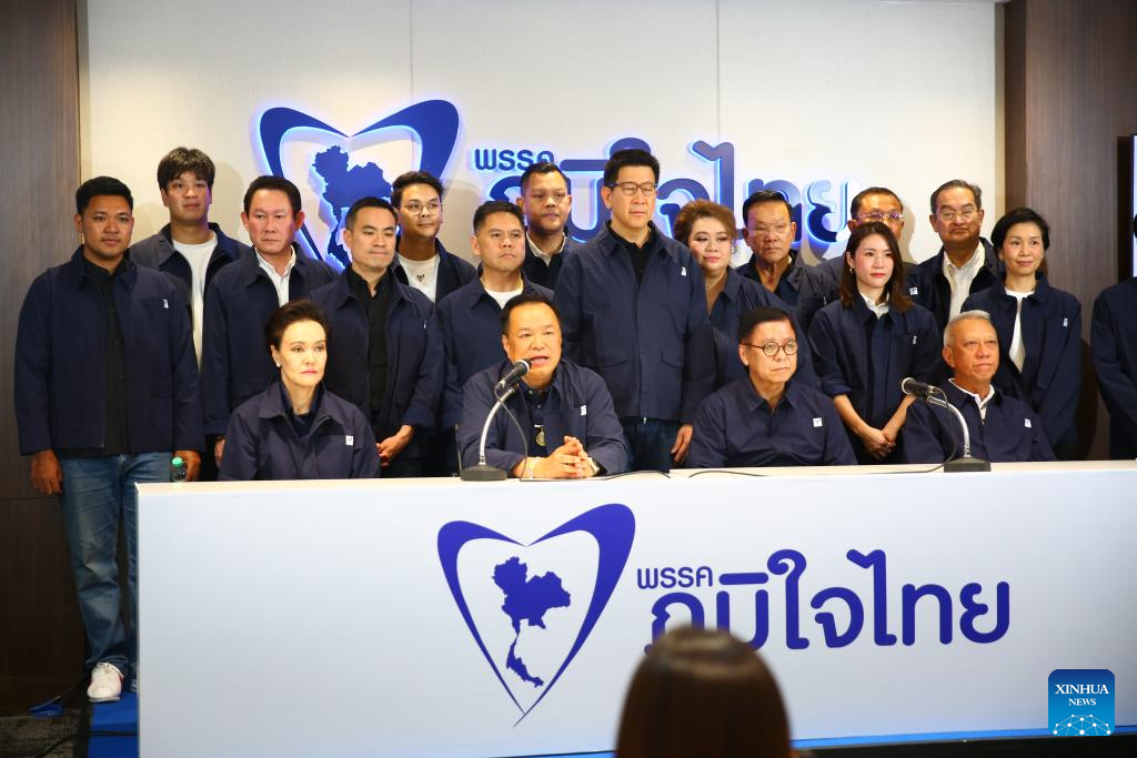 Thailand's caretaker Prime Minister and Bhumjaithai Party leader Anutin Charnvirakul (front, 2nd L) attends a press conference in Bangkok, capital of Thailand, Feb. 8, 2026. Anutin Charnvirakul said in a press conference that the Bhumjaithai Party has won Thailand's House of Representatives election on Feb. 8. (Xinhua/Wan Houde)