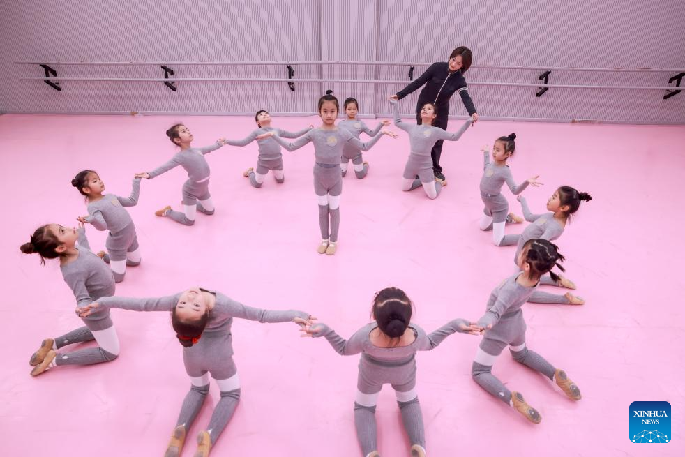Children rehearse a dance under the guidance of an instructor at an art education center in Wuhan, central China's Hubei Province, on Feb. 8, 2026. Various extracurricular activities are available for students across China during the winter vacation. (Photo by Zhao Jun/Xinhua)