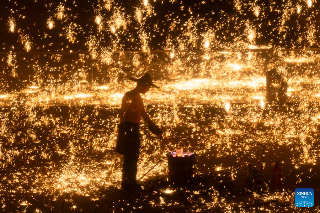 A molten iron fireworks show is staged by the Huangpu River in Pudong, east China's Shanghai, on Feb. 8, 2026. (Xinhua/Wang Xiang)