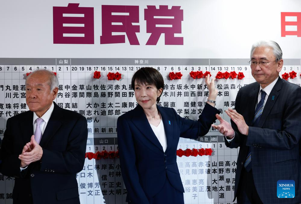 Japanese Prime Minister Sanae Takaichi (C), leader of Japan's ruling Liberal Democratic Party (LDP), places red flowers symbolizing success onto names of candidates at the headquarters of the LDP in Tokyo, Japan, Feb. 8, 2026. Japan's ruling coalition of the LDP and the Japan Innovation Party (JIP) won more than a two-thirds majority in the House of Representatives following Sunday's general election, public broadcaster NHK reported early Monday. (Kim Kyung-Hoon/Pool via Xinhua)