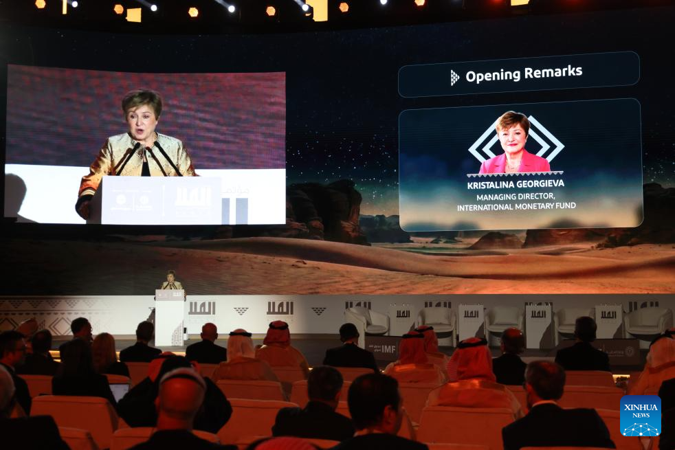 International Monetary Fund Managing Director Kristalina Georgieva addresses the opening ceremony of the second edition of AlUla Conference for Emerging Market Economies in Alula, Saudi Arabia, Feb. 8, 2026. The second edition of AlUla Conference for Emerging Market Economies opened here on Sunday, centering on the opportunities and challenges facing emerging market economies amid profound global economic changes. (Xinhua/Luo Chen)