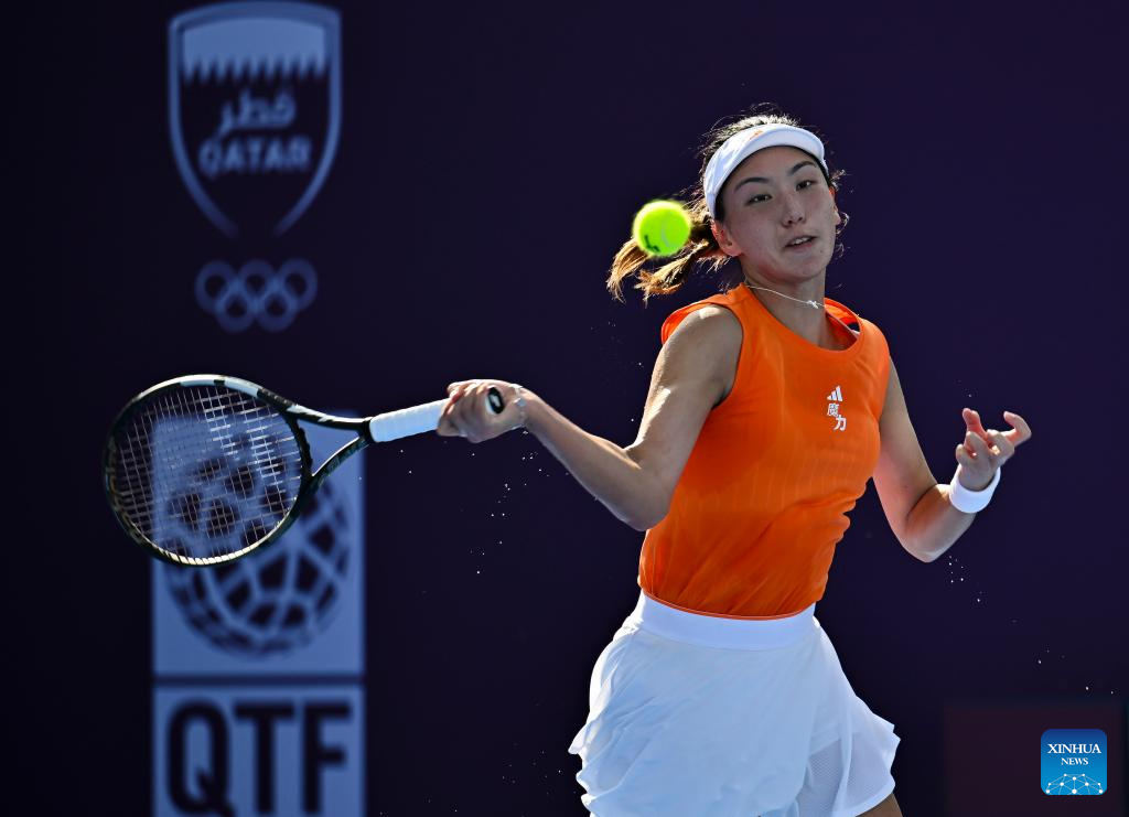 Wang Xinyu hits a return during the women's singles round of 64 match between Emiliana Arango of Colombia and Wang Xinyu of China at the WTA Qatar Open 2026 tennis tournament in Doha, Qatar, on Feb. 9, 2026. (Photo by Nikku/Xinhua)