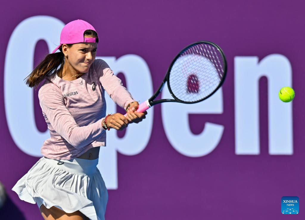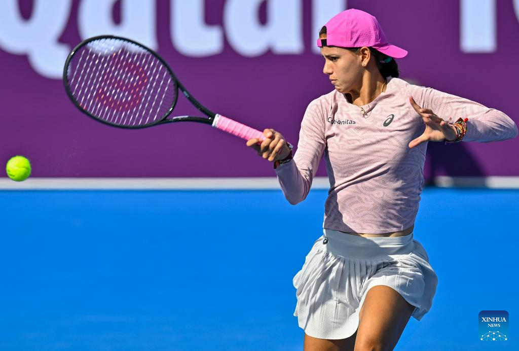 Emiliana Arango hits a return during the women's singles round of 64 match between Emiliana Arango of Colombia and Wang Xinyu of China at the WTA Qatar Open 2026 tennis tournament in Doha, Qatar, on Feb. 9, 2026. (Photo by Nikku/Xinhua)