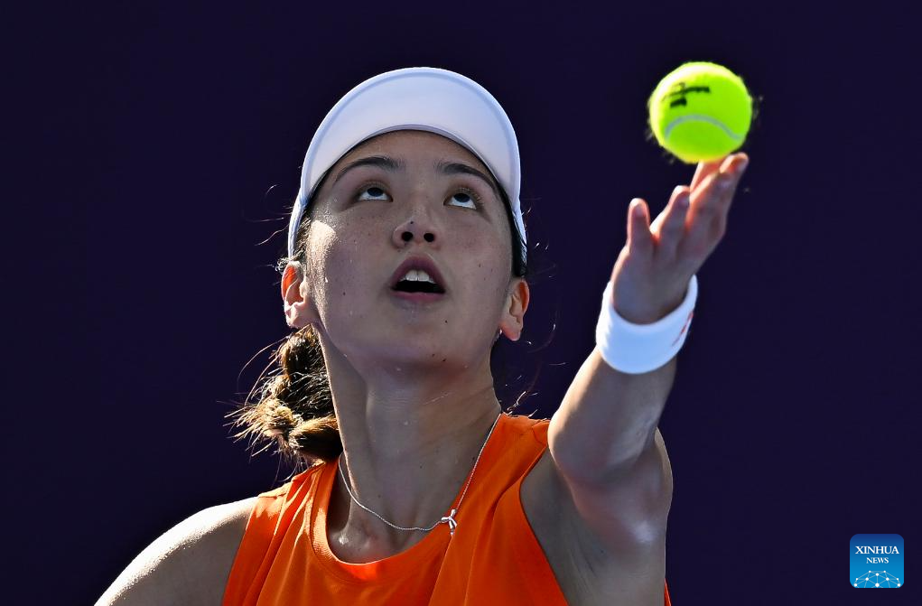 Wang Xinyu serves during the women's singles round of 64 match between Emiliana Arango of Colombia and Wang Xinyu of China at the WTA Qatar Open 2026 tennis tournament in Doha, Qatar, on Feb. 9, 2026.(Photo by Nikku/Xinhua)