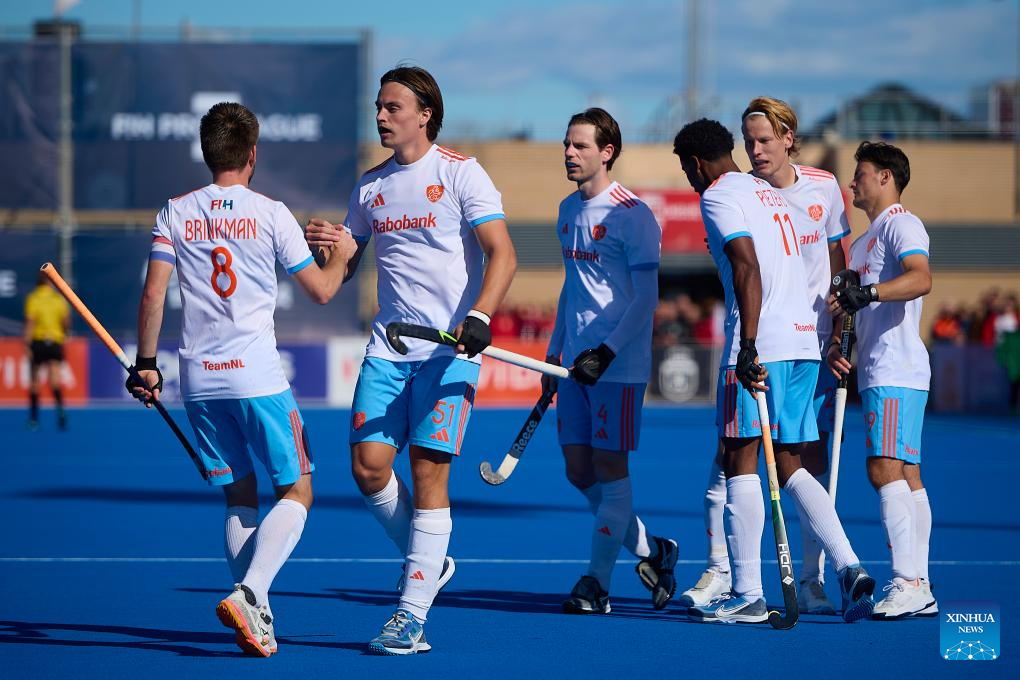 Players of the Netherlands celebrate a goal during an FIH Hockey Pro League men's match between Spain and the Netherlands in Valencia, Spain, Feb. 8, 2026. (Photo by Pablo Morano/Xinhua)