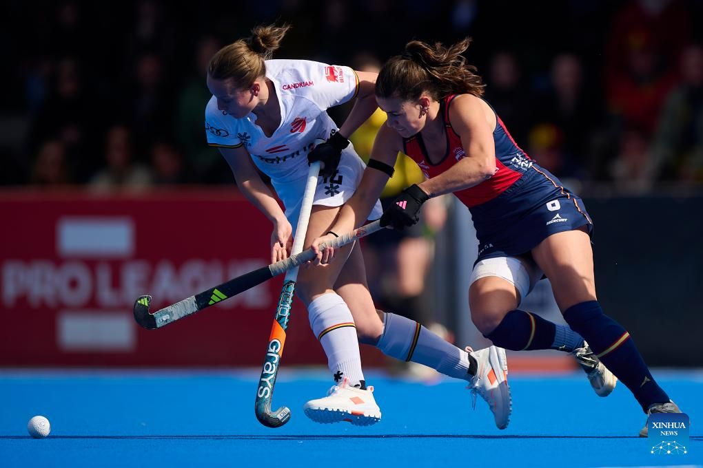 Lucia Jimenez (L) of Spain vies with Ambre Balleghien of Belgium during an FIH Hockey Pro League women's match between Spain and Belgium in Valencia, Spain, Feb. 8, 2026 (Photo by Pablo Morano/Xinhua)