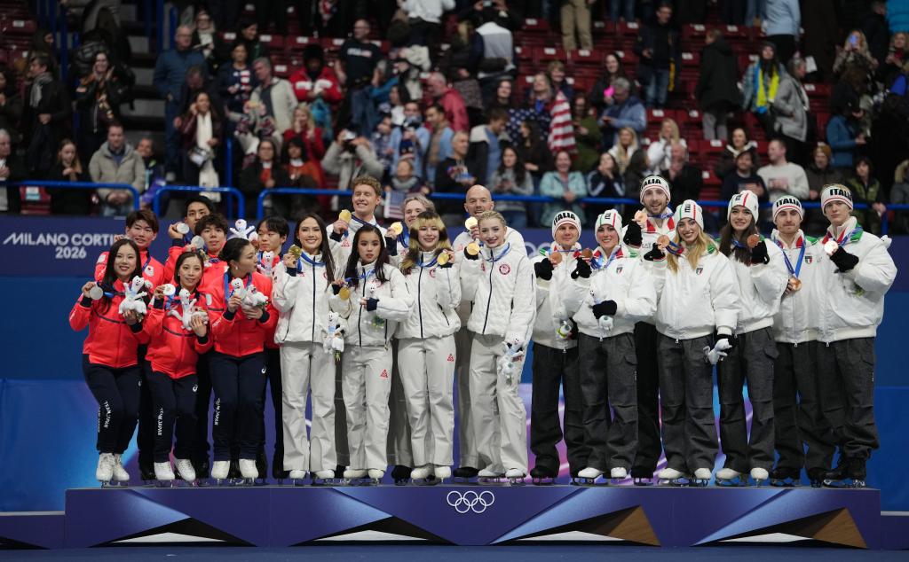 Gold medalists team the United States (C), silver medalists team Japan (L) and bronze medalists team Italy pose for photos during the awarding ceremony for the figure skating team event of the Milan-Cortina 2026 Olympic Winter Games in Milan, Italy, Feb. 8, 2026. (Xinhua/Xue Yuge)Ellie Kam (L)/Danny O'Shea of the United States perform during the figure skating team event pair skating free skating of the Milan-Cortina 2026 Olympic Winter Games in Milan, Italy, Feb. 8, 2026. (Xinhua/Xue Yuge)Amber Glenn of team the United States celebrates with her gold medal after the awarding ceremony for the figure skating team event of the Milan-Cortina 2026 Olympic Winter Games in Milan, Italy, Feb. 8, 2026. (Xinhua/Li Ming)Amber Glenn of the United States competes during the women single skating free skating of the figure skating team event of the Milan-Cortina 2026 Olympic Winter Games in Milan, Italy, Feb. 8, 2026. (Xinhua/Li Ming)Ilia Malinin of the United States competes during the figure skating team event men single skating free skating of the Milan-Cortina 2026 Olympic Winter Games in Milan, Italy, Feb. 8, 2026. (Xinhua/Chen Yichen)Ilia Malinin of the United States competes during the figure skating team event men single skating free skating of the Milan-Cortina 2026 Olympic Winter Games in Milan, Italy, Feb. 8, 2026. (Xinhua/Chen Yichen)Ilia Malinin of the United States competes during the figure skating team event men single skating free skating of the Milan-Cortina 2026 Olympic Winter Games in Milan, Italy, Feb. 8, 2026. (Xinhua/Cheng Min)Sakamoto Kaori (C) of Japan reacts after her performance during the figure skating team event women single skating free skating of the Milan-Cortina 2026 Olympic Winter Games in Milan, Italy, Feb. 8, 2026. (Xinhua/Xue Yuge)