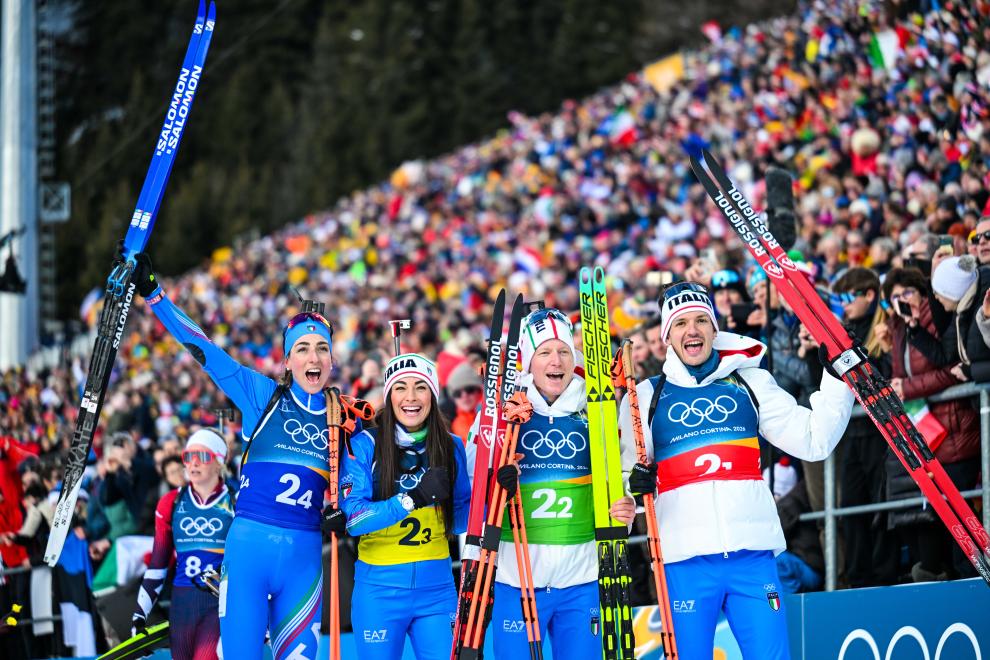 France opened the biathlon program by winning gold in the mixed 4x6km relay. Anchor Julia Simon shot clean, hitting all 10 targets, as France finished in 1:04:15.5. Italy earned silver on home snow, with Germany taking bronze.