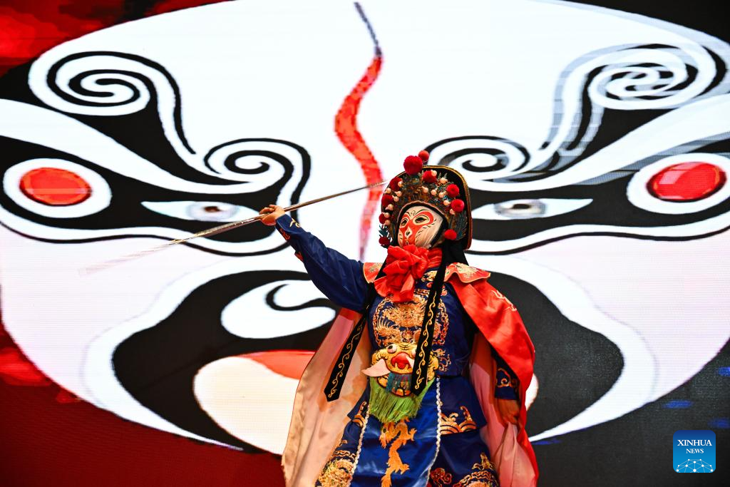 An artist stages a face-changing performance at a Spring Festival gala in Cairo, Egypt, on Feb. 8, 2026. The gala was held here on Sunday to celebrate the upcoming Chinese Spring Festival, where participants enjoyed traditional Chinese cuisine, experienced intangible cultural heritages, and watched cultural performances. (Xinhua/Xin Mengchen)