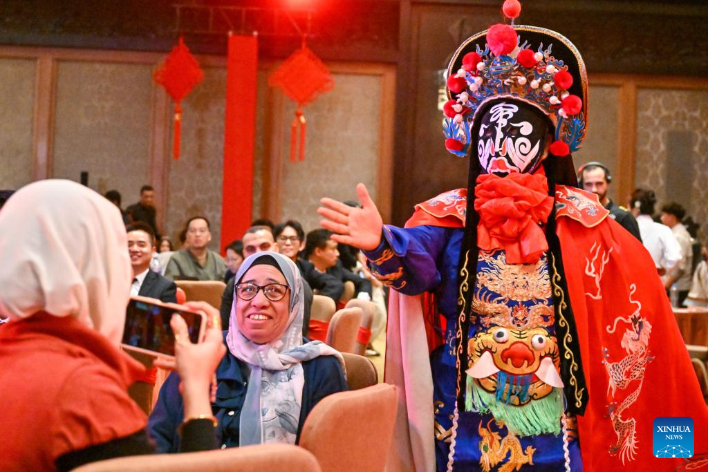 An artist interacts with the audience during a face-changing performance at a Spring Festival gala in Cairo, Egypt, on Feb. 8, 2026. The gala was held here on Sunday to celebrate the upcoming Chinese Spring Festival, where participants enjoyed traditional Chinese cuisine, experienced intangible cultural heritages, and watched cultural performances. (Xinhua/Xin Mengchen)