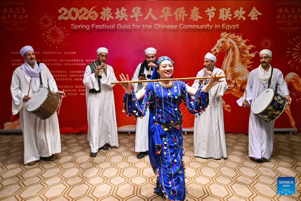 Artists perform at a Spring Festival gala in Cairo, Egypt, on Feb. 8, 2026. The gala was held here on Sunday to celebrate the upcoming Chinese Spring Festival, where participants enjoyed traditional Chinese cuisine, experienced intangible cultural heritages, and watched cultural performances. (Xinhua/Xin Mengchen)