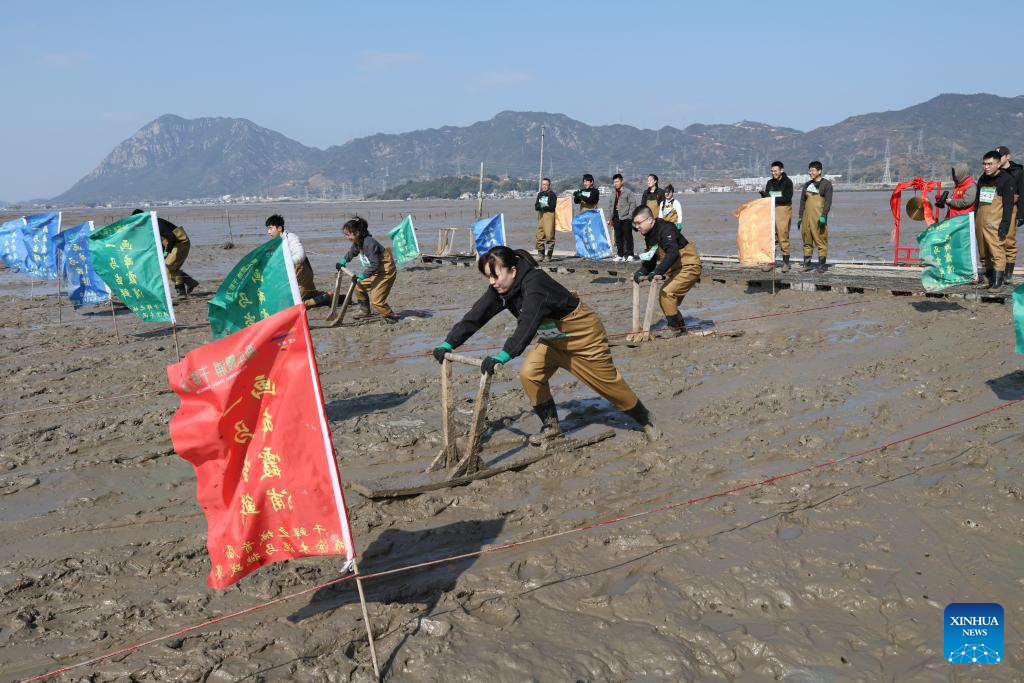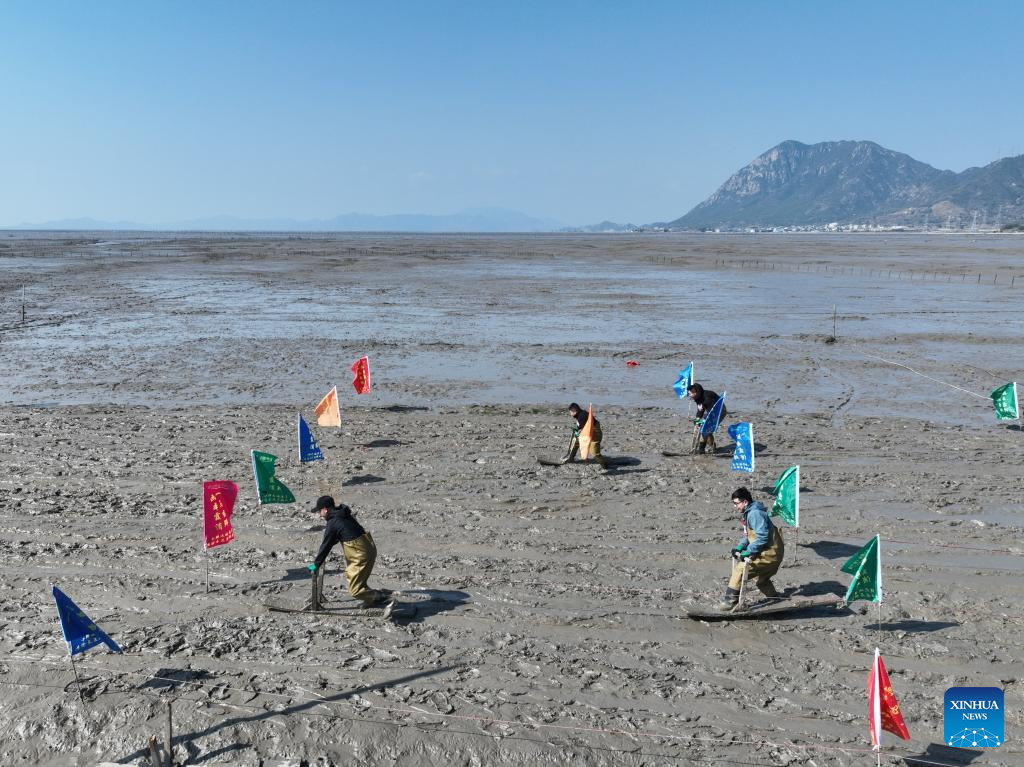 People attend a "munima" racing competition in Xiapu County, southeast China's Fujian Province, Feb. 8, 2026. "Munima," meaning "wooden mud horse" in Chinese, is a traditional sled-like tool for gliding over tidal flats to pick up seafood. Horse-themed tourism has surged recently in Xiapu County as the lunar Year of the Horse approaches. (Xinhua/Jiang Kehong)