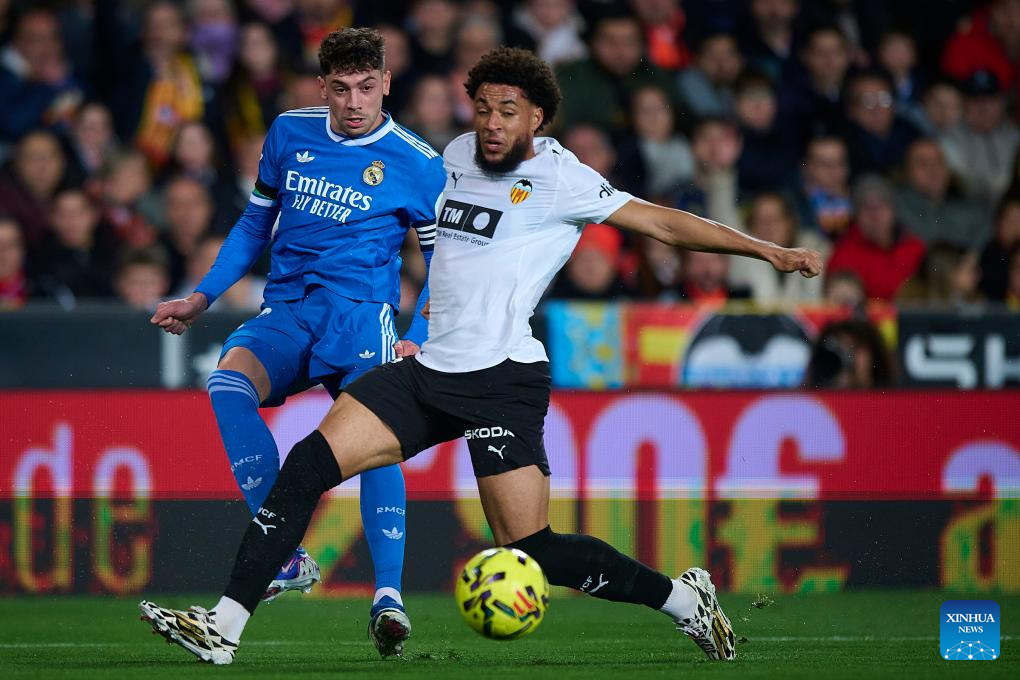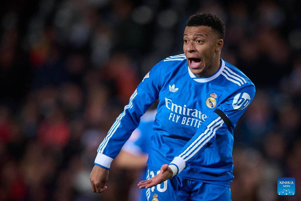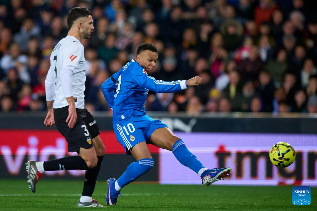 MADRID, Feb. 8 (Xinhua) -- Second-half goals from left back Alvaro Carreras and Kylian Mbappe gave Real Madrid a 2-0 win away to Valencia on Sunday night, keeping the defending champion one point behind FC Barcelona in the La Liga title race.