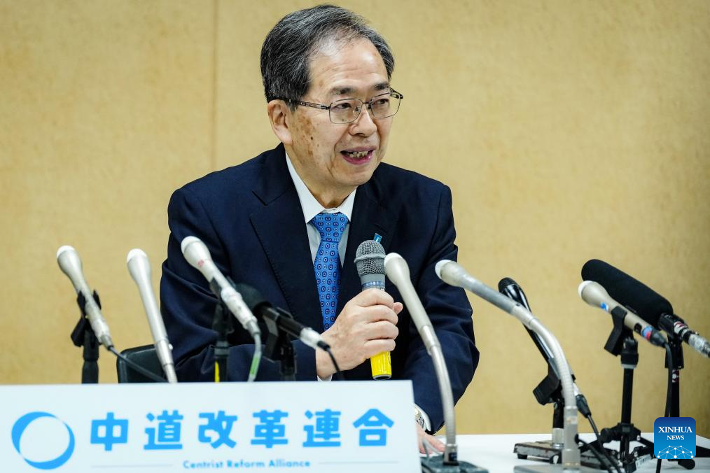 Tetsuo Saito, co-leader of Japan's main opposition party Centrist Reform Alliance, speaks during a press conference in Tokyo, Japan, Feb. 9, 2026. Yoshihiko Noda and Tetsuo Saito, co-leaders of Japan's main opposition party Centrist Reform Alliance, announced on Monday that they would resign from their posts to take responsibility for the party's defeat in the House of Representatives election. (Xinhua/Jia Haocheng)