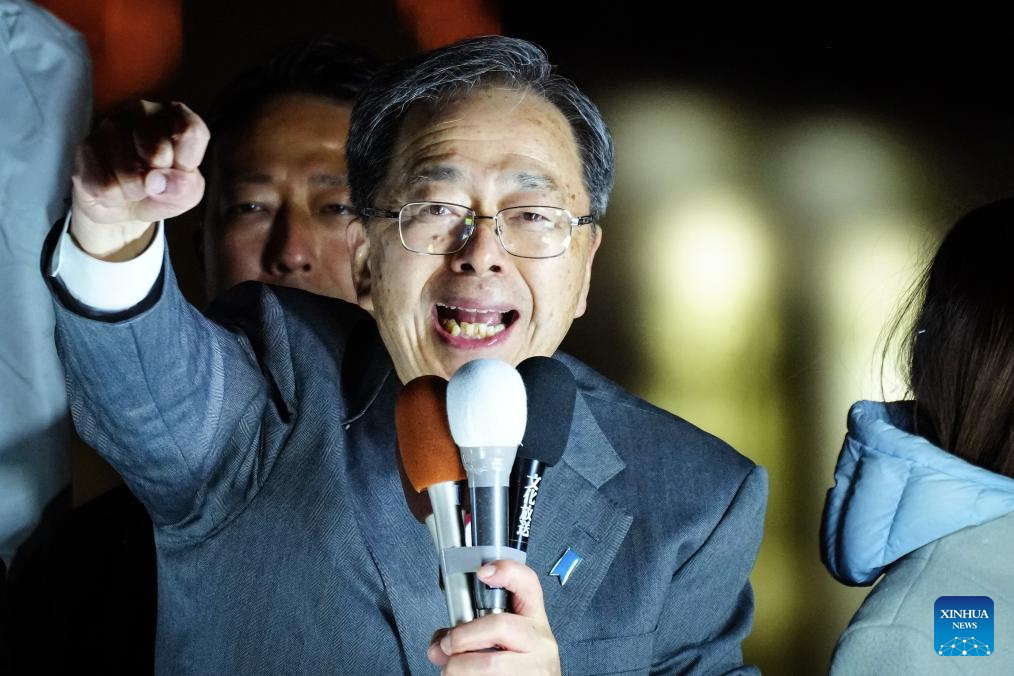 Tetsuo Saito, co-leader of Japan's main opposition party Centrist Reform Alliance, gives a speech on the street in Tokyo, Japan, Feb. 7, 2026. Yoshihiko Noda and Tetsuo Saito, co-leaders of Japan's main opposition party Centrist Reform Alliance, announced on Monday that they would resign from their posts to take responsibility for the party's defeat in the House of Representatives election. (Xinhua/Jia Haocheng)