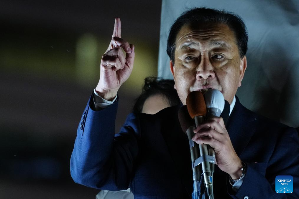 Yoshihiko Noda, co-leader of Japan's main opposition party Centrist Reform Alliance, gives a speech on the street in Tokyo, Japan, Feb. 7, 2026. Yoshihiko Noda and Tetsuo Saito, co-leaders of Japan's main opposition party Centrist Reform Alliance, announced on Monday that they would resign from their posts to take responsibility for the party's defeat in the House of Representatives election. (Xinhua/Jia Haocheng)