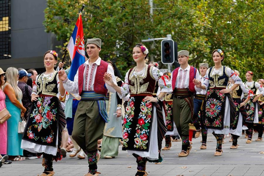 People wearing Serbian traditional clothes attend the 2026 National Multicultural Festival in Canberra, Australia, Feb. 7, 2026. (Photo by Chu Chen/Xinhua)