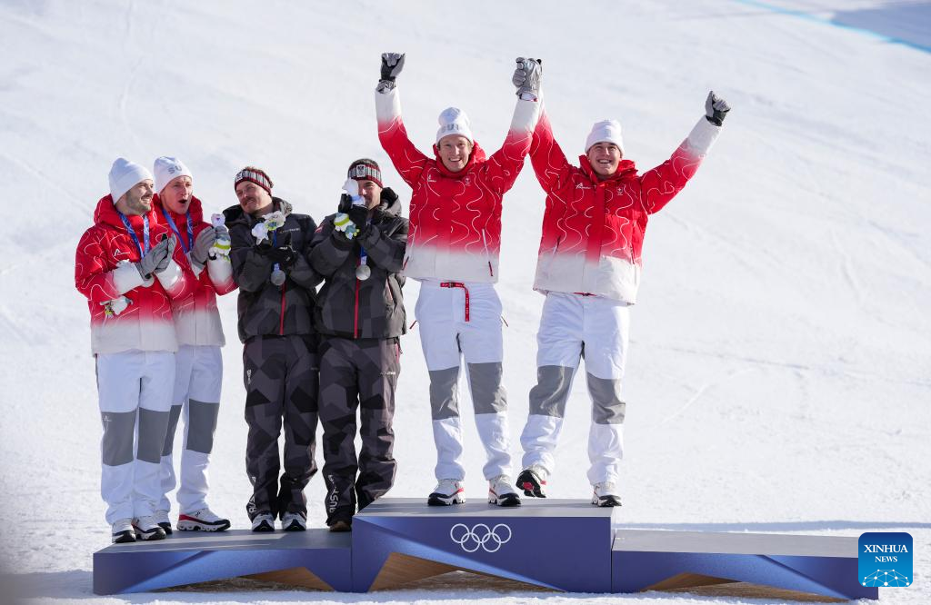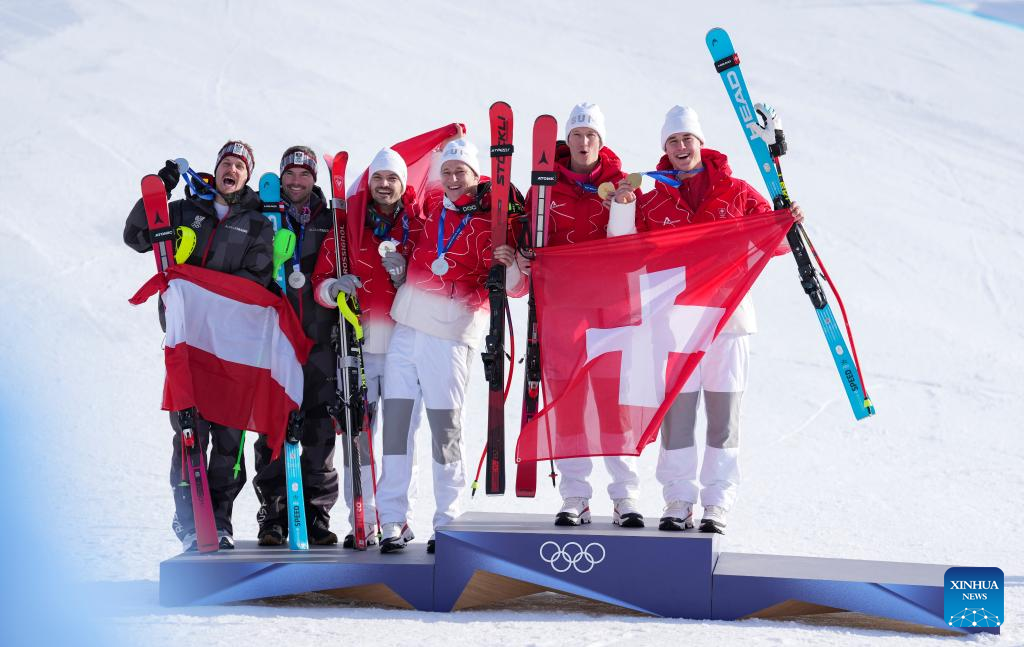 Gold medalists Franjo von Allmen (1st R)/Tanguy Nef of Switzerland 2, and silver medalists Marco Odermatt (3rd R)/Loic Meillard of Switzerland 1 and Vincent Kriechmayr (2nd L)/Manuel Feller of Austria 1 pose for a group photo during the awarding ceremony of the alpine skiing men's team combined at the Milan-Cortina 2026 Olympic Winter Games in Bormio, Italy, Feb. 9, 2026. (Xinhua/Hu Huhu)