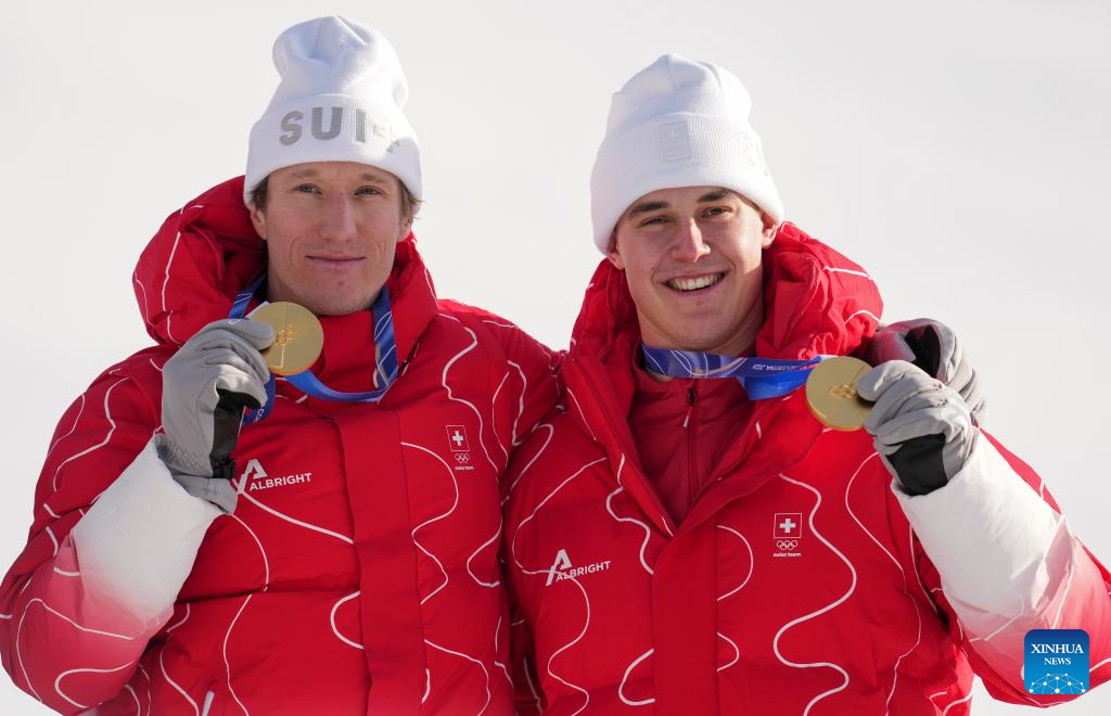 Gold medalists Franjo von Allmen (R) and Tanguy Nef of Switzerland 2 pose for a photo during the awarding ceremony of the alpine skiing men's team combined at the Milan-Cortina 2026 Olympic Winter Games in Bormio, Italy, Feb. 9, 2026. (Xinhua/Hu Huhu)