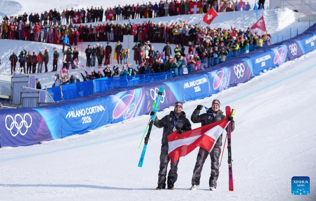 Vincent Kriechmayr (L)/Manuel Feller of Austria 1 pose for a photo after the awarding ceremony of the alpine skiing men's team combined at the Milan-Cortina 2026 Olympic Winter Games in Bormio, Italy, Feb. 9, 2026. (Xinhua/Hu Huhu)
