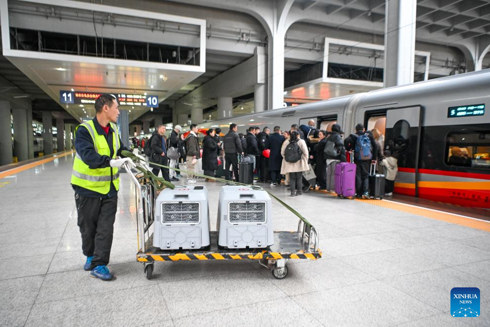 Passengers can book the service in advance through 12306, the China Railway booking platform, for their qualified domesticated pets. These pet passengers travel in dedicated pet transport cases equipped with air circulation as well as temperature and humidity monitoring systems. (Xinhua/Tang Yi)
