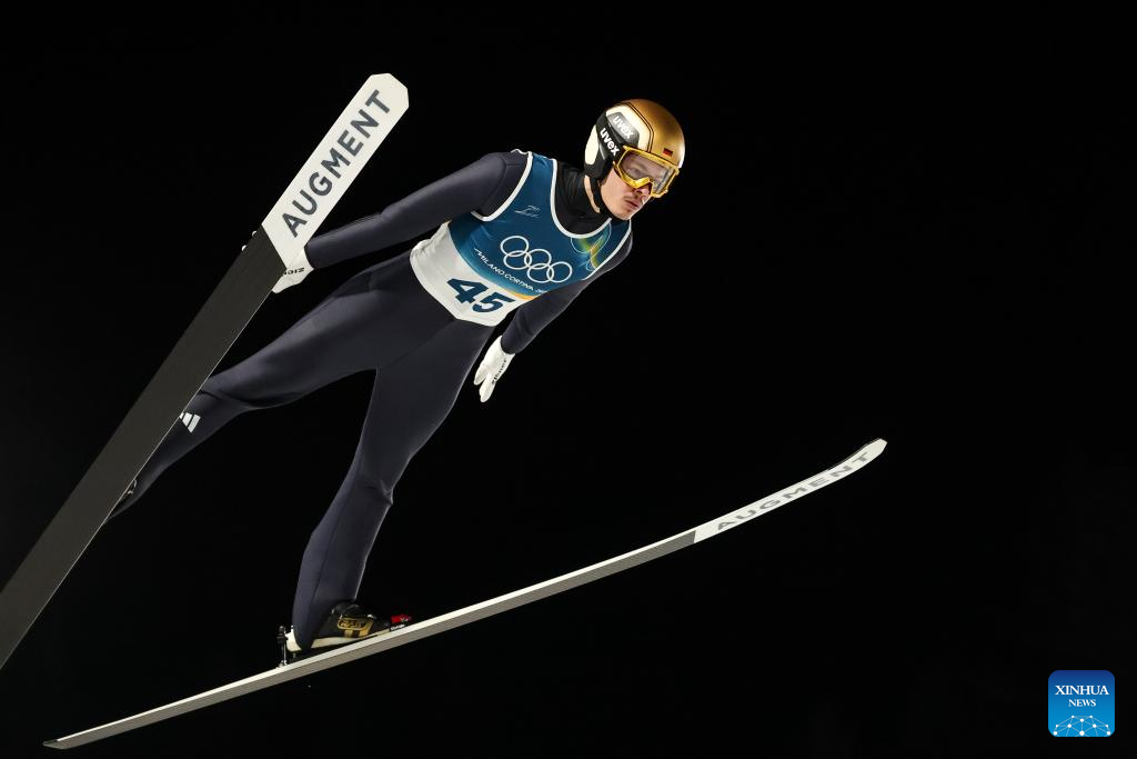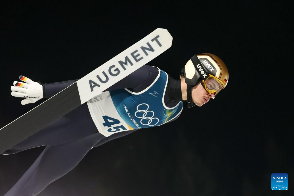Philipp Raimund of Germany competes during the Ski Jumping Men's Normal Hill Individual of the 2026 Milan-Cortina Winter Olympics in Predazzo, Italy, Feb. 9, 2026. (Xinhua/Meng Yongmin)