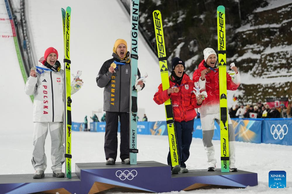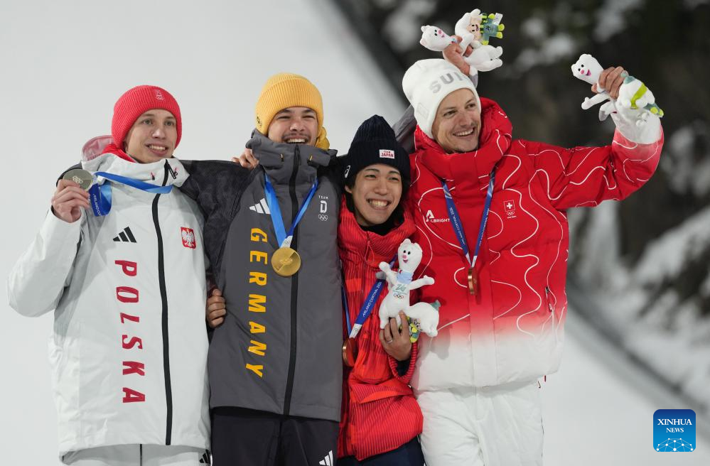 Gold medallist Philipp Raimund of Germany (2nd L), silver medalist Kacper Tomasiak of Poland (1st L), bronze medalists Nikaido Ren (2nd R) of Japan and Gregor Deschwanden of Switzerland pose for photos with the medals during the awarding ceremony for the Ski Jumping Men's Normal Hill Individual of the 2026 Milan-Cortina Winter Olympics in Predazzo, Italy, Feb. 9, 2026. (Xinhua/Meng Yongmin)
