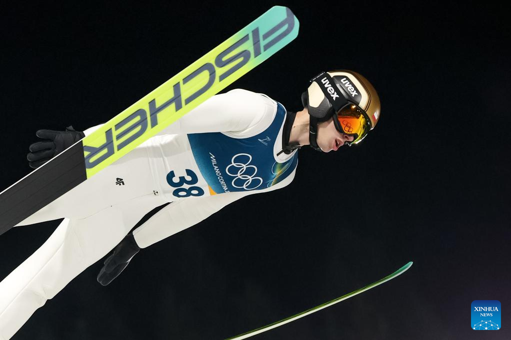 Kacper Tomasiak of Poland competes during the Ski Jumping Men's Normal Hill Individual of the 2026 Milan-Cortina Winter Olympics in Predazzo, Italy, Feb. 9, 2026. (Xinhua/Huang Wei)