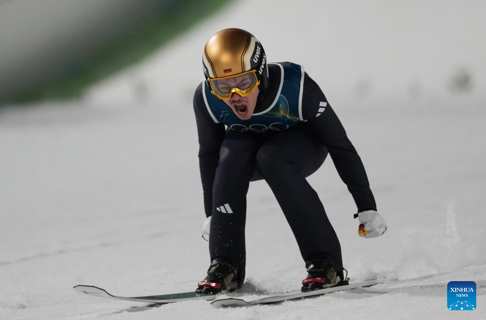 Philipp Raimund of Germany celebrates during the Ski Jumping Men's Normal Hill Individual of the 2026 Milan-Cortina Winter Olympics in Predazzo, Italy, Feb. 9, 2026. (Xinhua/Meng Yongmin)