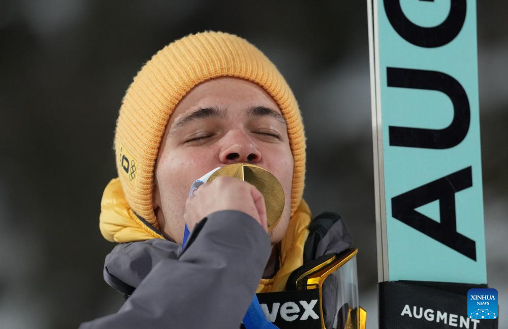 Gold medallist Philipp Raimund of Germany kisses the medal during the awarding ceremony for the Ski Jumping Men's Normal Hill Individual of the 2026 Milan-Cortina Winter Olympics in Predazzo, Italy, Feb. 9, 2026. (Xinhua/Meng Yongmin)