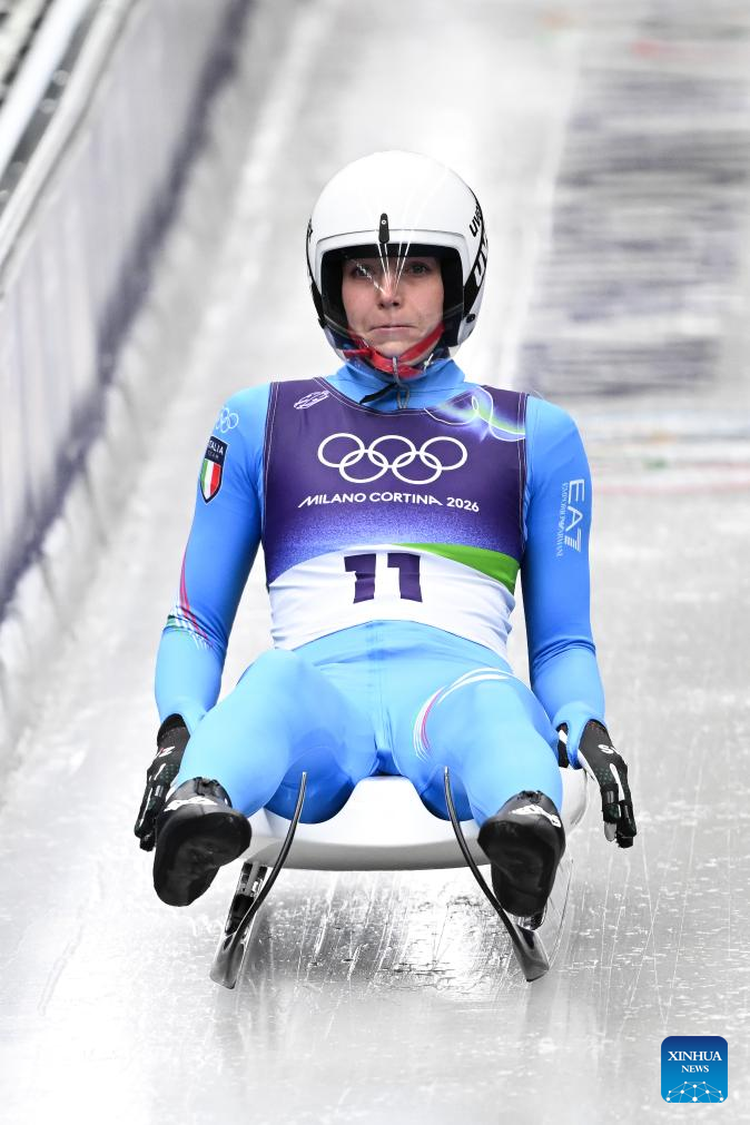 Verena Hofer of Italy competes during the luge women's singles run 1 at the Milan-Cortina 2026 Olympic Winter Games in Cortina, Italy, Feb. 9, 2026. (Xinhua/Lian Yi)