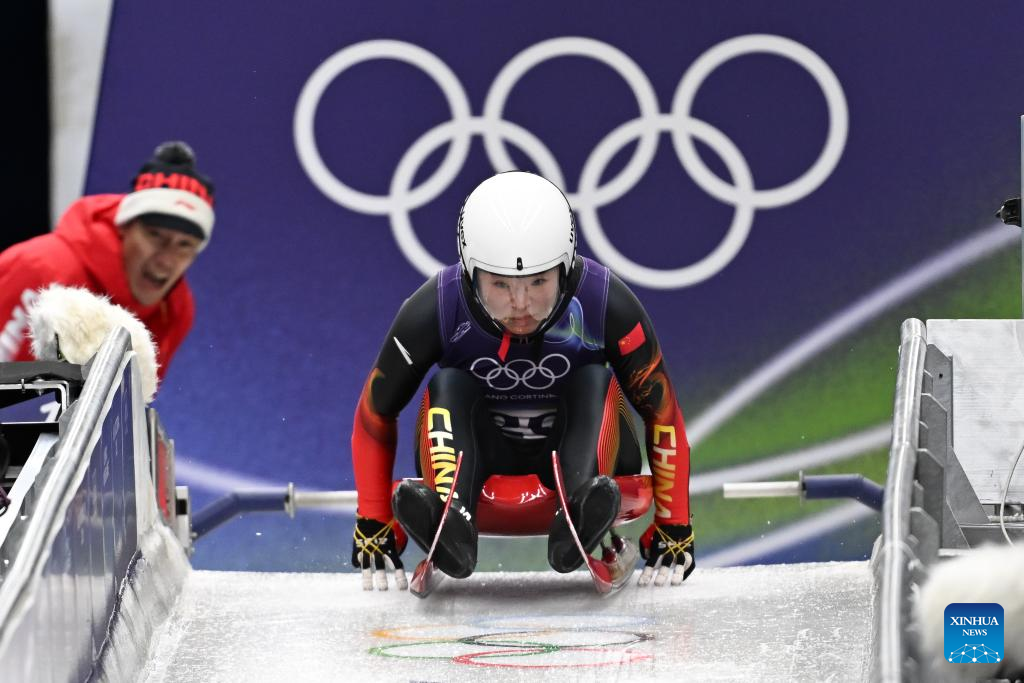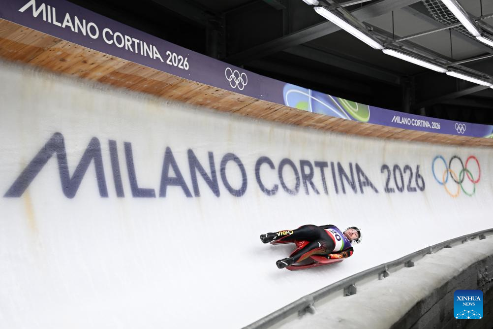 Wang Peixuan of China competes during the luge women's singles run 2 at the Milan-Cortina 2026 Olympic Winter Games in Cortina, Italy, Feb. 9, 2026. (Xinhua/Lian Yi)